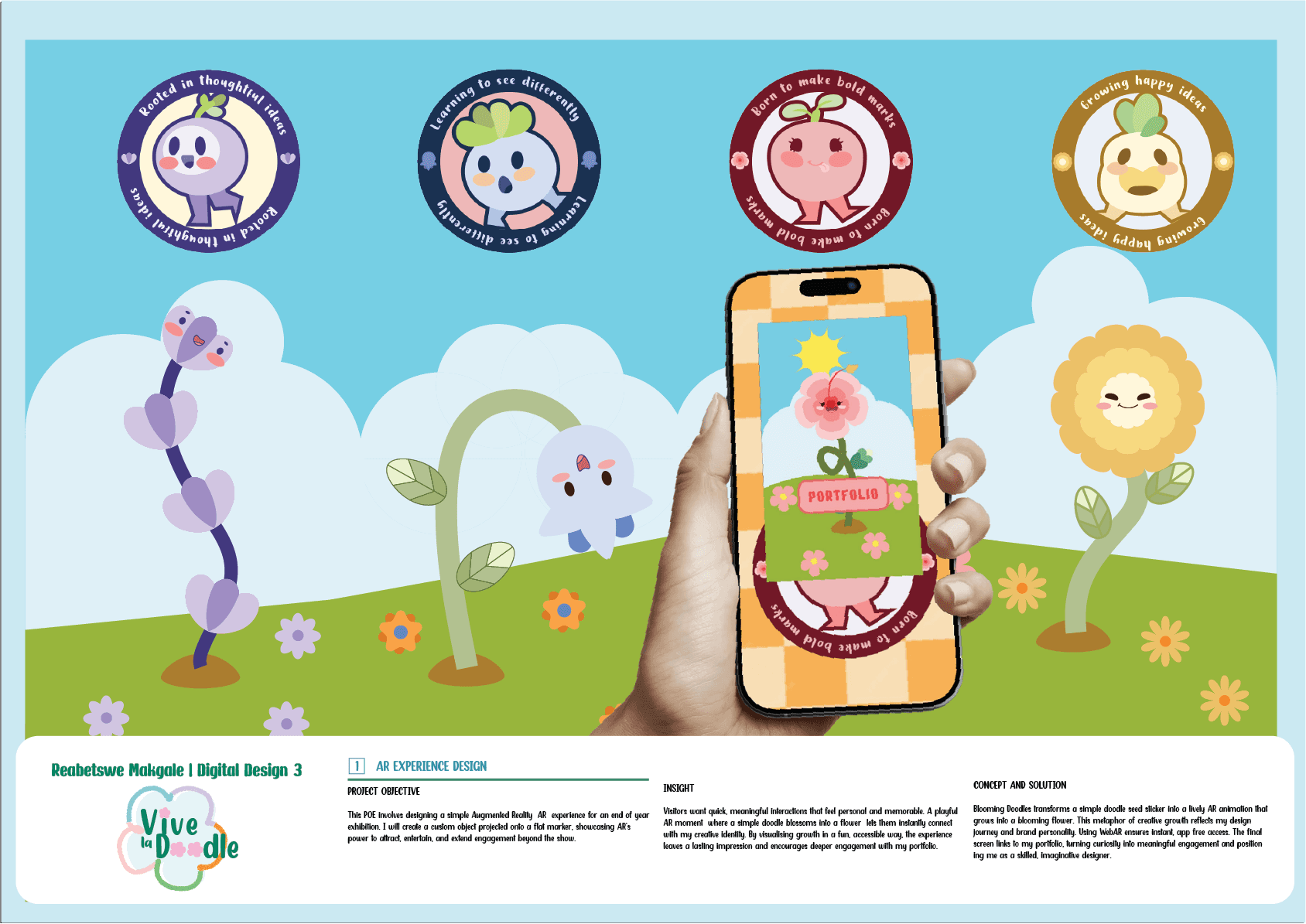 A playful AR interaction where visitors scan a doodle-seed sticker to watch a cute, illustrated plant sprout and bloom in augmented reality. The experience uses simple motion graphics, light interactivity, and WebAR for instant access, turning my illustrative style into a living moment of creative growth that invites viewers to explore my work further.