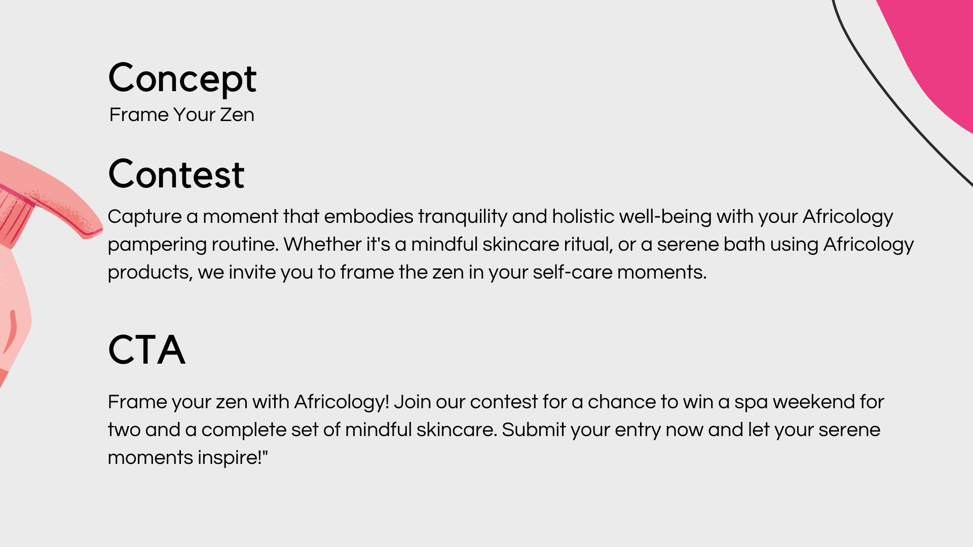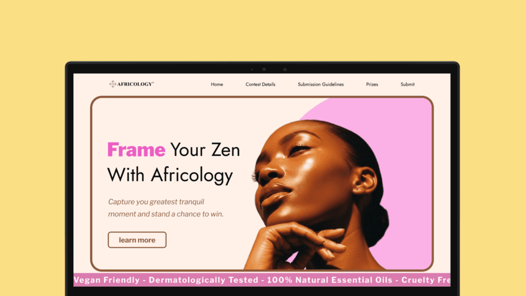 The key challenge was creating a digital experience that genuinely reflects Africology’s holistic, tranquil identity while still meeting the functional demands of an online competition. The microsite needed to feel calming yet compelling, visually rich yet minimal, and informative without overwhelming users. Balancing brand storytelling with clear, intuitive interaction design was essential—ensuring that users could enter effortlessly, avoid confusion or friction, and feel cared for throughout the experience, just as they would with Africology’s physical products.