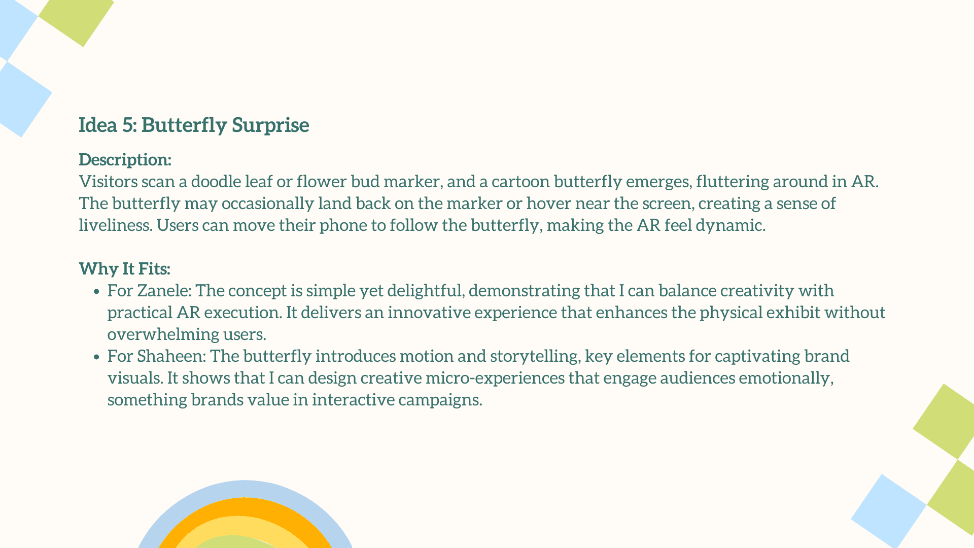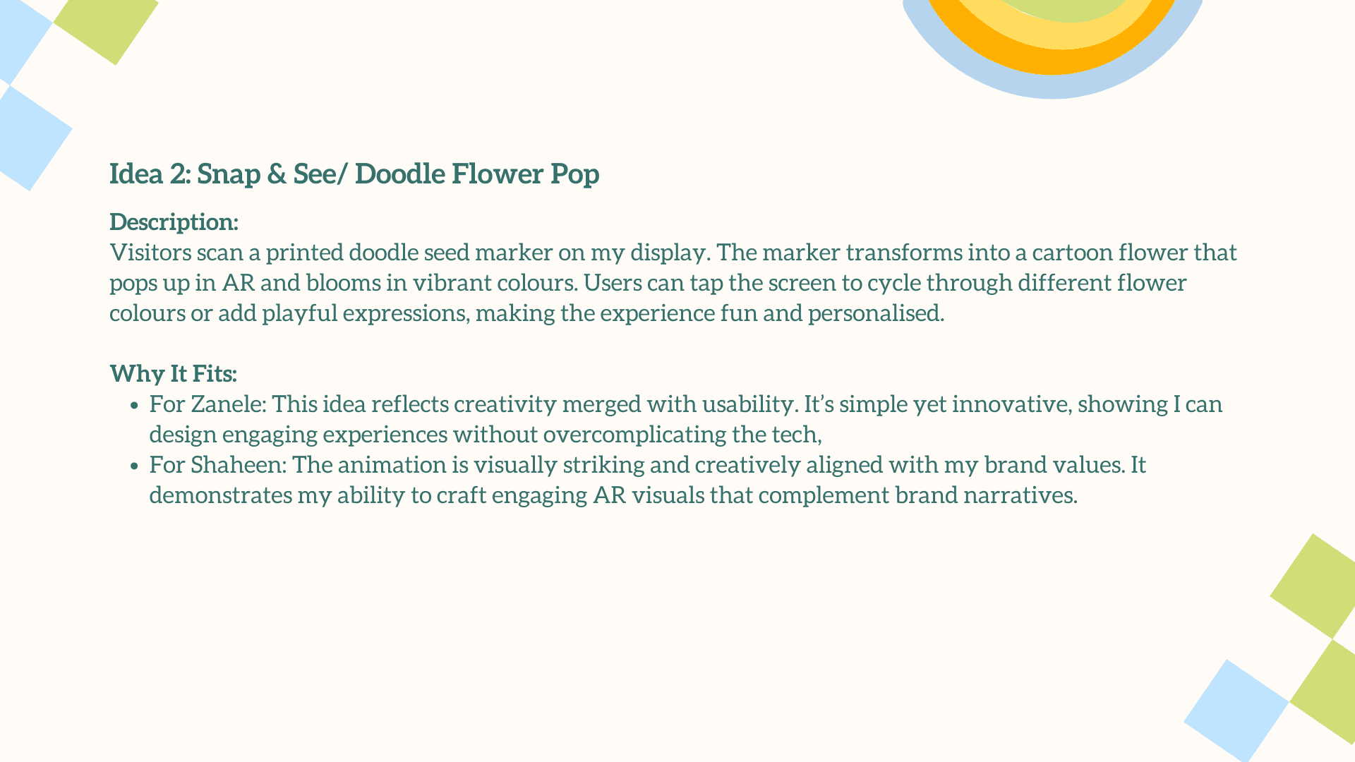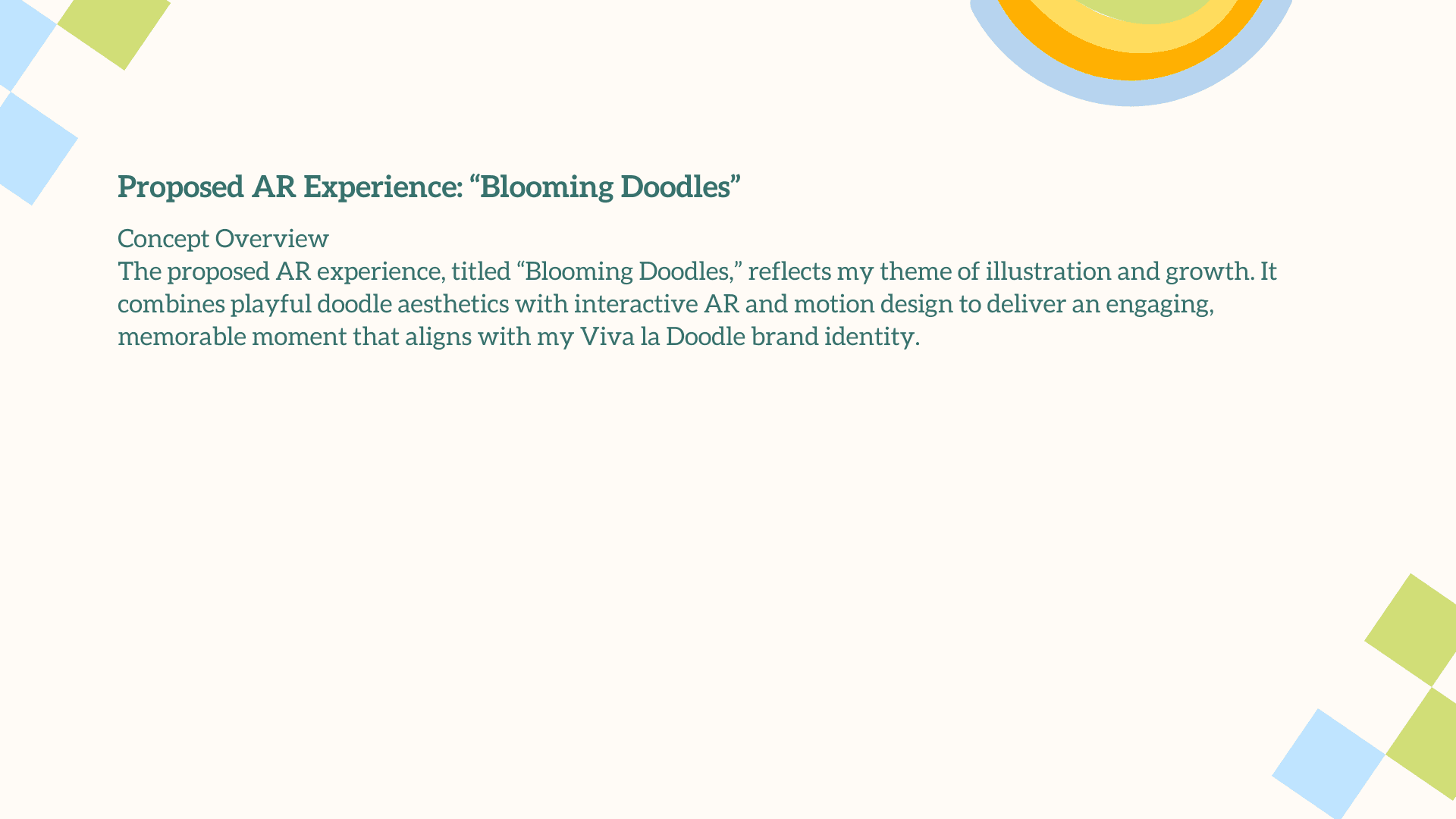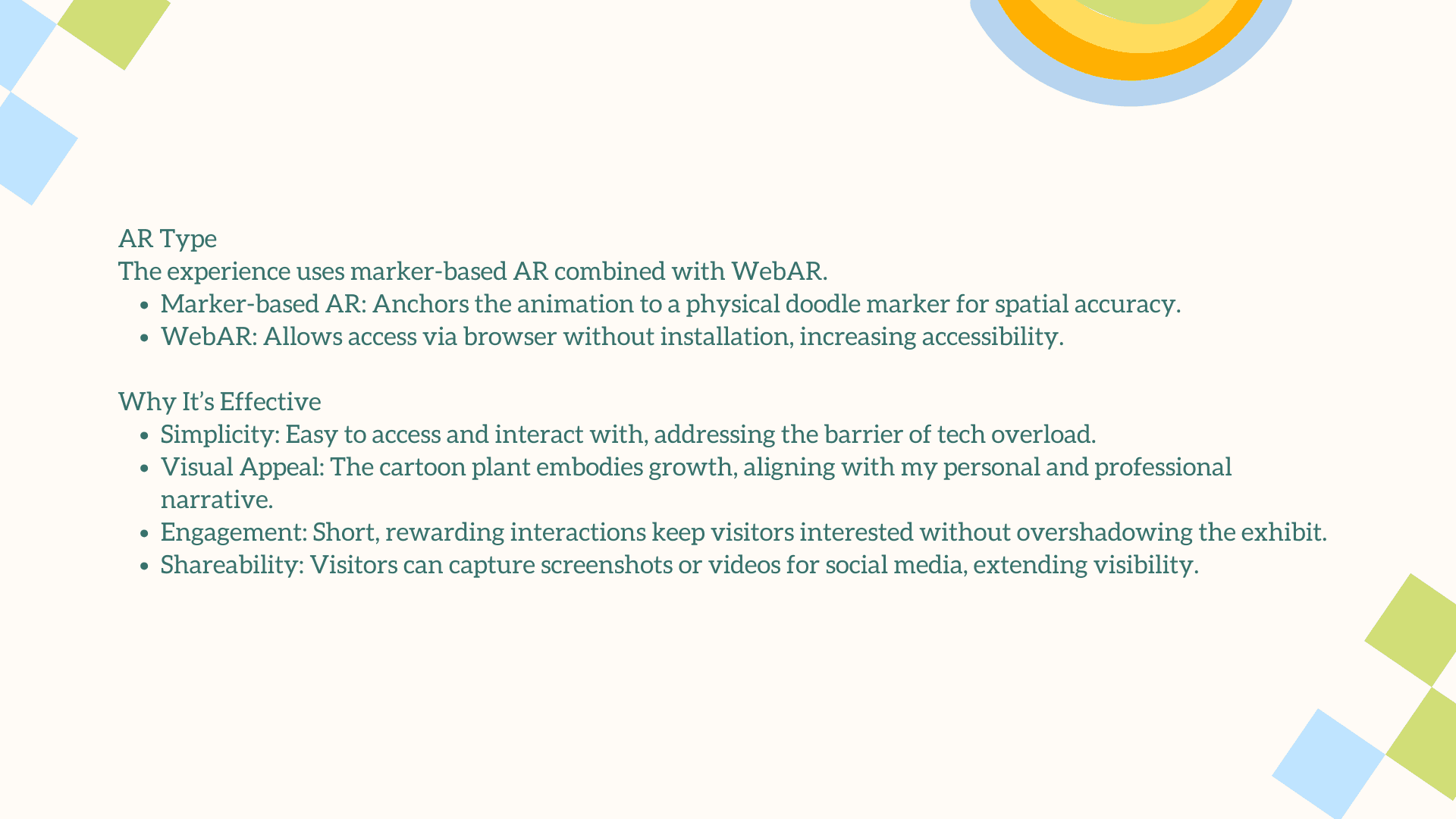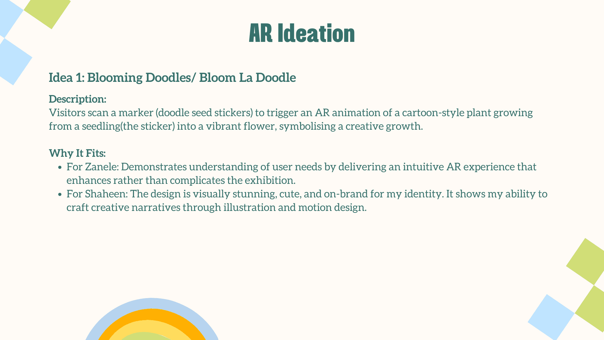 The main challenge was translating a deeply personal, illustrative style into an engaging AR experience without losing its charm and emotional warmth. The interaction had to feel simple, intuitive, and instantly rewarding for users who may be unfamiliar with AR. Balancing visual playfulness with clear UX, creating animations that enhanced rather than overwhelmed the doodles, and ensuring each plant symbol meaningfully represented your growth as a designer were essential. The goal was to craft an AR moment that felt magical, yet purposeful.