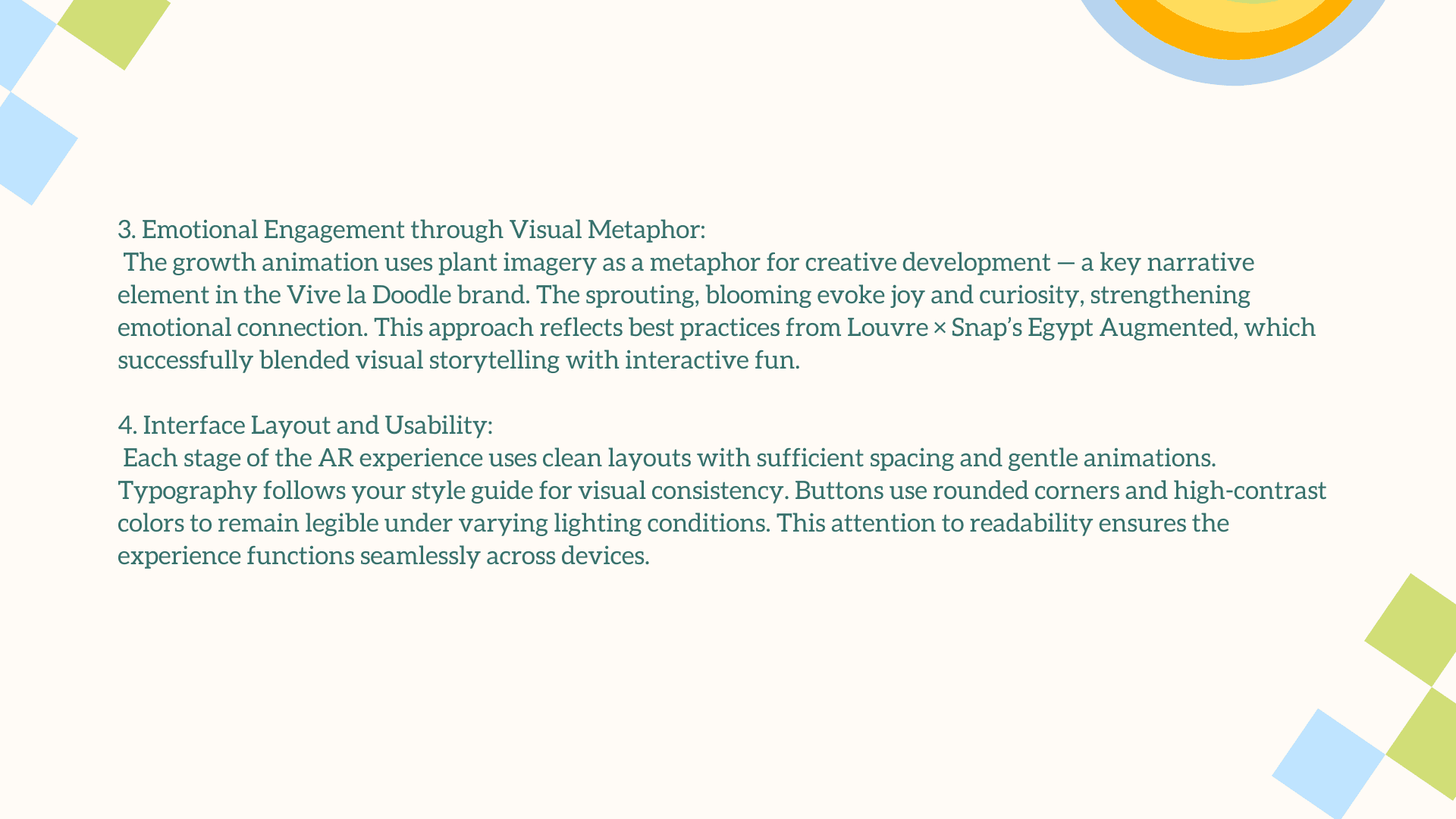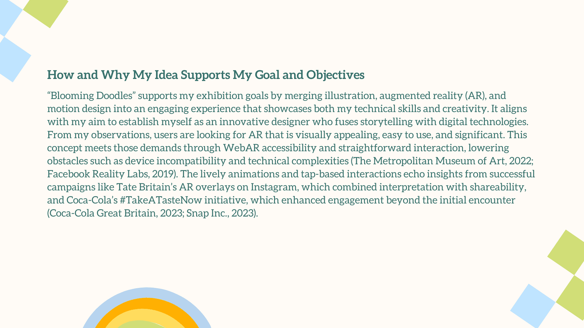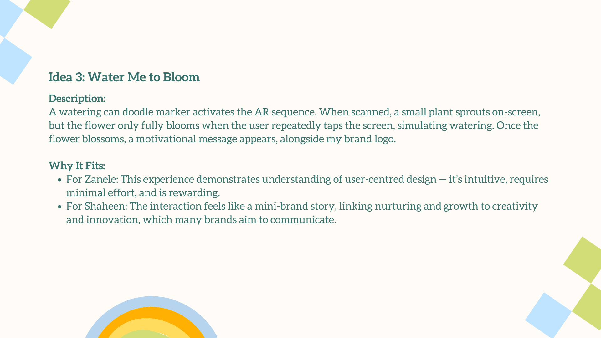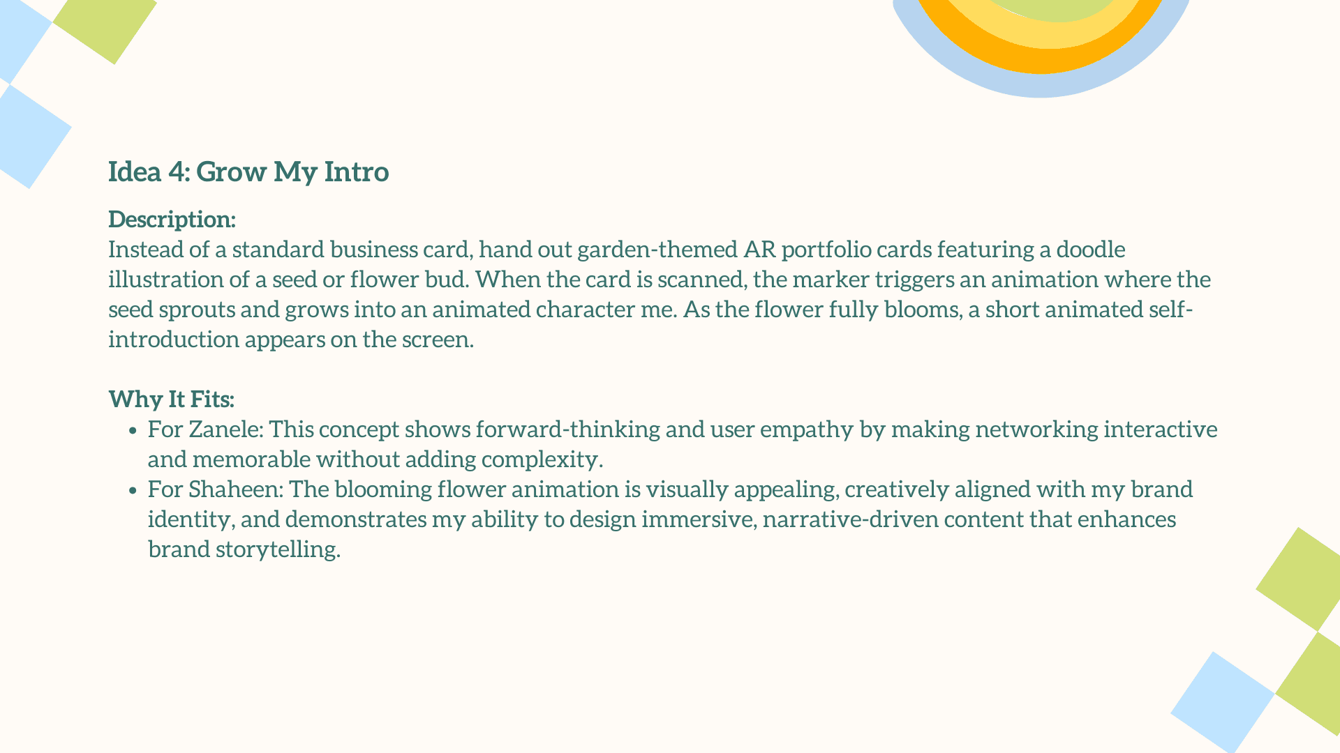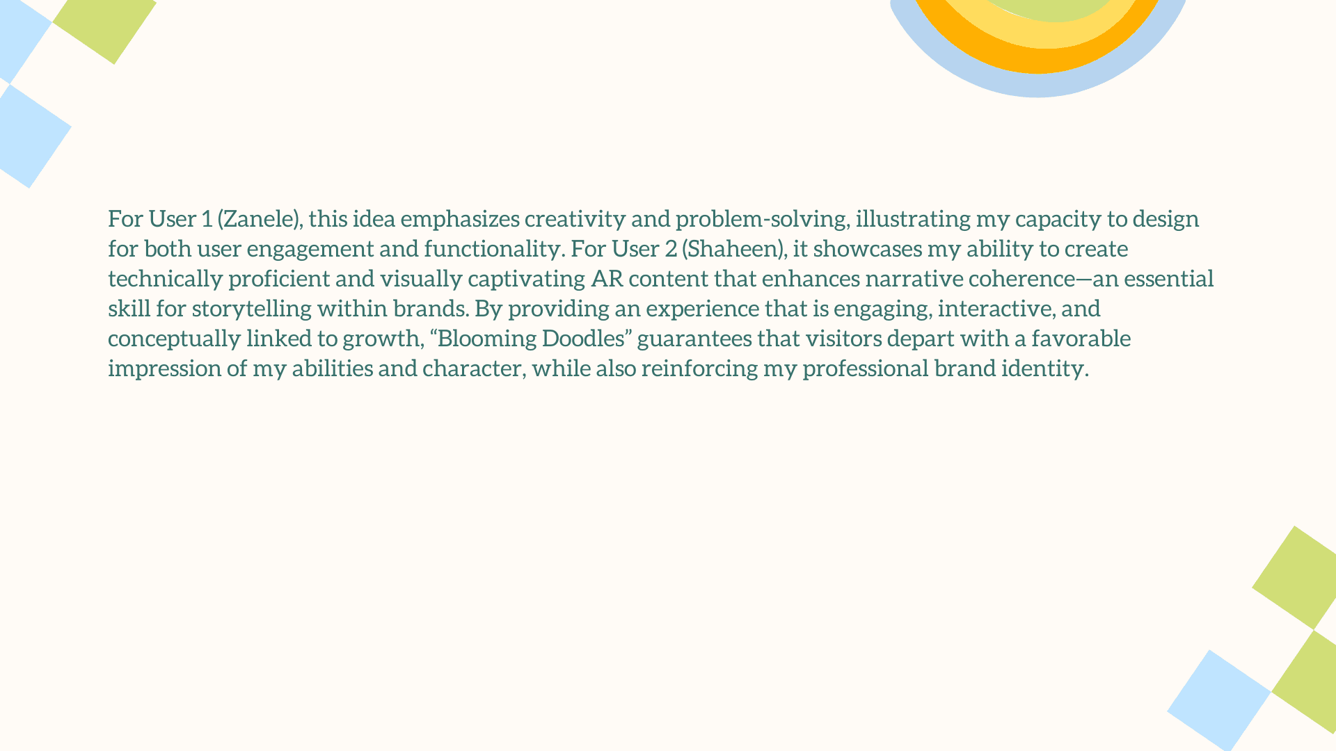 The main challenge was translating a deeply personal, illustrative style into an engaging AR experience without losing its charm and emotional warmth. The interaction had to feel simple, intuitive, and instantly rewarding for users who may be unfamiliar with AR. Balancing visual playfulness with clear UX, creating animations that enhanced rather than overwhelmed the doodles, and ensuring each plant symbol meaningfully represented your growth as a designer were essential. The goal was to craft an AR moment that felt magical, yet purposeful.