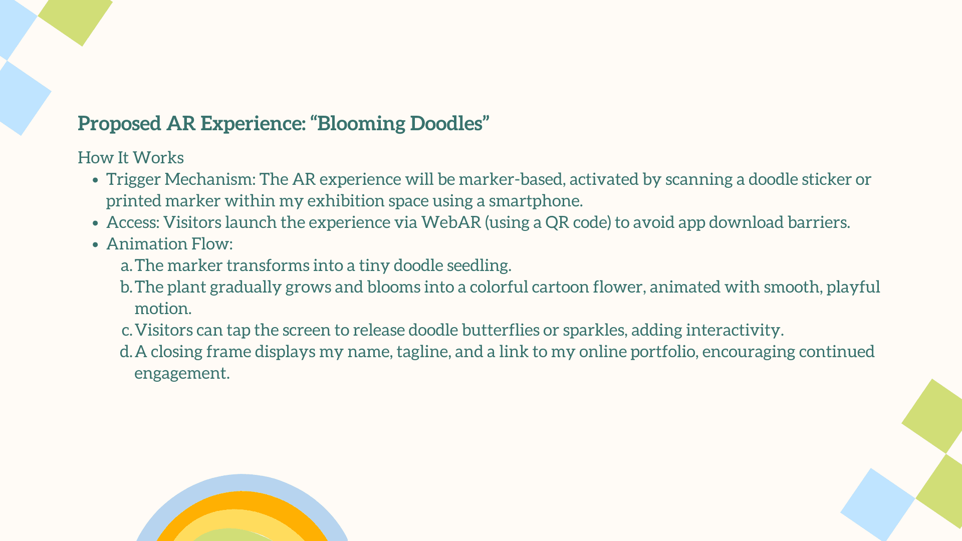 Blooming Doodles is a WebAR experience created for my final design showcase. Visitors scan a doodle-seed sticker to trigger a short animated sequence where a cartoon plant grows and blooms, symbolising creative growth. Designed with marker-based WebAR, simple motion graphics, and playful interactivity, the experience reflects my illustrative style while offering an accessible, memorable way for viewers to engage with my work and explore my portfolio.